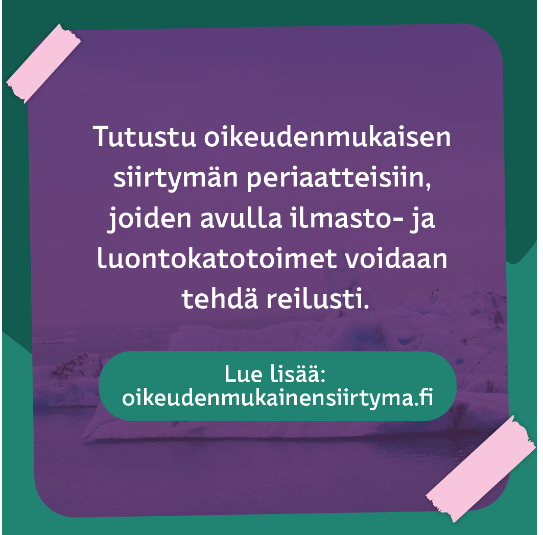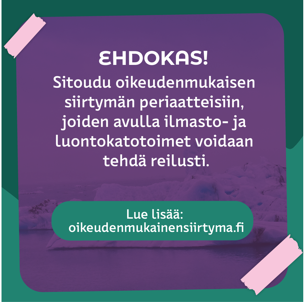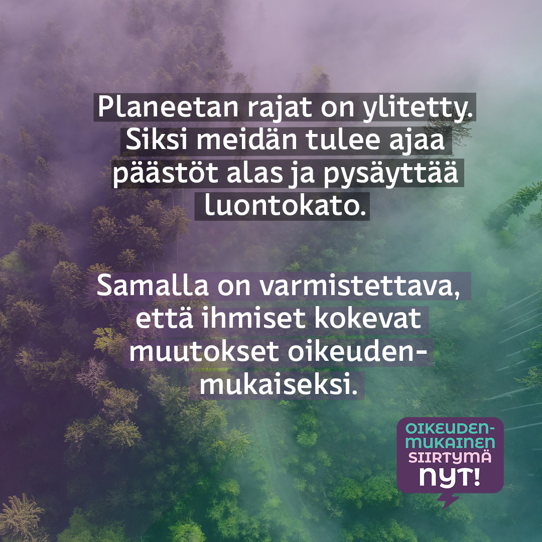 Ilmastokriisi ja luontokato on pysäytettävä! Samalla on varmistettava oikeudenmukainen siirtymä. Ehdokas, sitoudu oikeudenmukaisen siirtymän periaatteisiin oikeudenmukainensiirtyma.fi #OikeudenmukainenSiirtyma